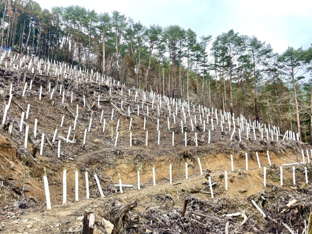 植樹された苗木の保護カバーが目立ちます。